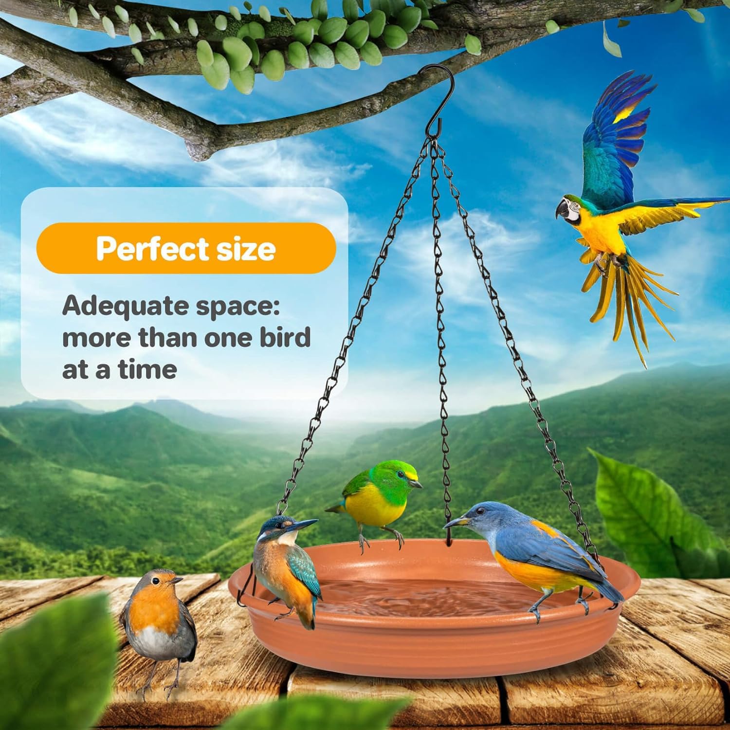 - EASY AND HANDY – Our handy hanging bird bath requires no installation tools, feel free to hang the bird bath tray on a wrought iron hanger or tree branch while hanging bird water or bird seed to attract birds to your yard. You can sit in your yard with your family and relax as you watch the birds bathe, drink, feed and nest, and enjoy the sounds and sights of the beautiful bird.